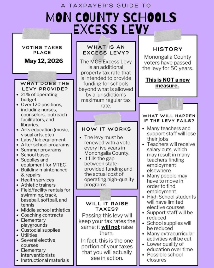 Please come out and vote on May 12th for the Mon County Schools Excess Levy. Passing this levy will NOT raise your taxes, it maintains the current funding level. Failing to pass the levy, however, will result in salary cuts and job losses at Monongalia County Schools.